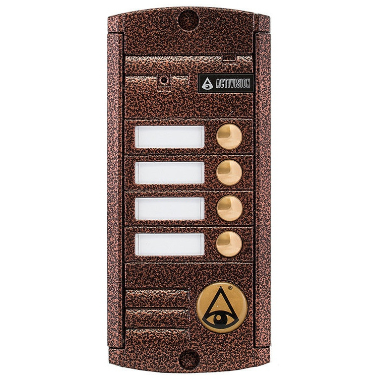 4-х проводная антивандальная накладная видеопанель, 4-х абонентная, с встроенным Proxy считывателем. Корпус медного цвета с ИК подсветкой до 0,6м, матрица 1/3", разрешение 1000ТВл, 12В, угол обзора 75 (гор.) 55 (верт.); рабочий диапазон t - 30… + 55; 155х70х20мм.