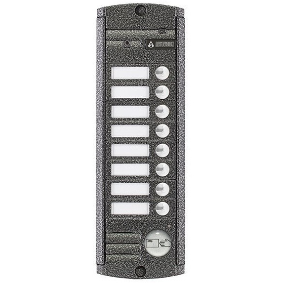 4-х проводная антивандальная накладная видеопанель, 8-ми абонентная, со встроенным Proxy считывателем. Корпус цвета антик с ИК подсветкой до 0,6м. Матрица 1/3", разрешение 1000 ТВл, 12В, угол обзора 75 (гор.) 55 (верт.); рабочий диапазон t - 50… + 55; размеры 215х70х20 мм.
