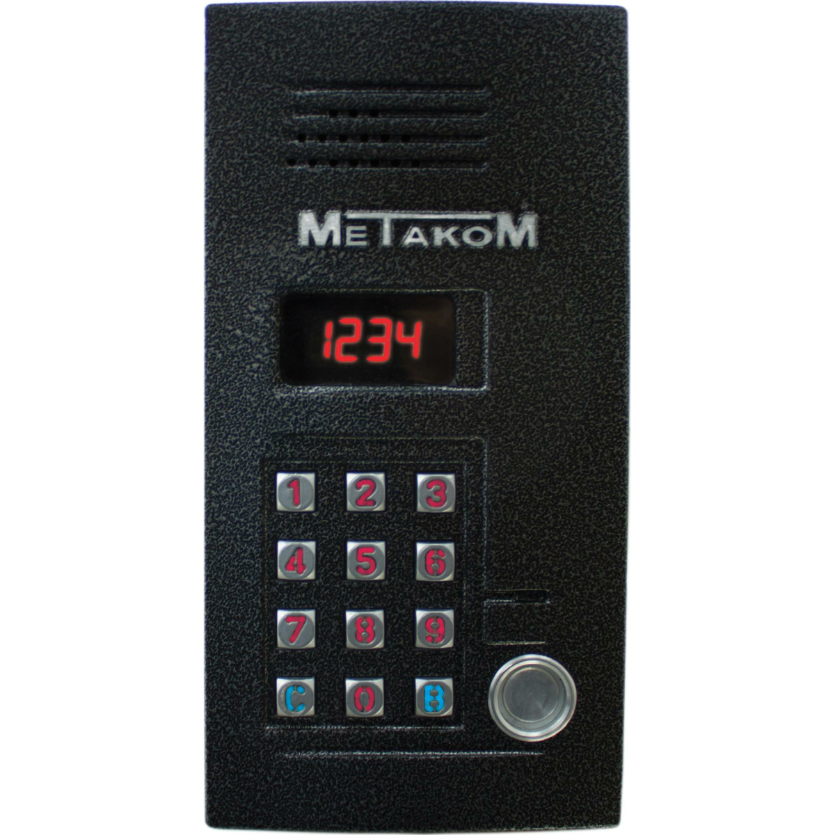 Многоабонентый антивандальный блок вызова МЕТАКОМ MK2012-TM4E, оснащён цветной видеокамерой и инфракрасной подсветкой, емкость абонентов до 999 (при использовании до 15 коммутаторов), возможность переноса базы ключей через микросхему памяти, возможность регулировки громкости вызывного сигнала в абонентском устройстве, задание диапазона обслуживаемых абонентов. Оборудован контактным считывателем для ключей TM или DS1990. Габариты: 205x105x40мм