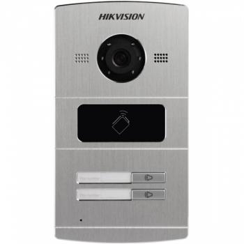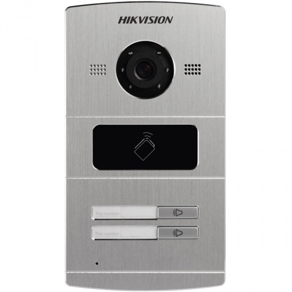 IP вызывная панель на 2-х абонентов. Корпус IP65, рабочая температура -40 до +70 C. Встроенная IP-видеокамера 720p, 25Fps. ИК-подсветка. Встроенный считыватель IC-карт. Двусторонняя аудиосвязь: встроенный динамик и микрофоном с шумо-эхоподавлением. RJ-45, тревожные входы/выходы (4/1), RS-485, 12В. / PoE (с коммутаторами HikVision DS-KAD606 или DS-KAD612). Датчик двери и тампер. Размеры 182×100×32.5 мм. Бокс для врезного монтажа включен в комплект поставки.TCP/IP, SNMP, SIP, RTSP.