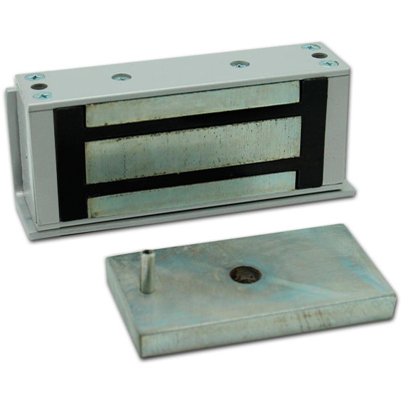 Замок электромагнитный, 300 кг, 12В/330мА пост.тока, встроенная цепь размагничивания, для эксплуатации внутри помещений. В комплекте крепежный уголок.