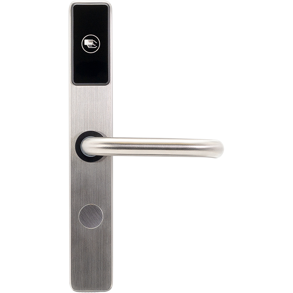 Замок гостиничный беспроводной. Дизайн "Матовое серебро", материал: нержавеющая сталь Вся электроника и приводы в накладке. Допускается установка на существующий врезной механизм, DIN цилиндр Функции быстрой смены направления ручек и защелки