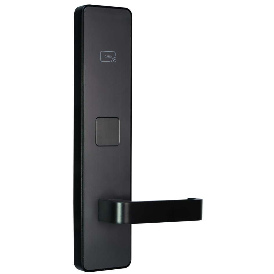 Замок гостиничный беспроводной. Дизайн "Матовый темно-серый", материал: алюминий на стальном шасси, покрытие методом IMD Врезной механизм типа Euro, ригель и защелка - нержавеющая сталь