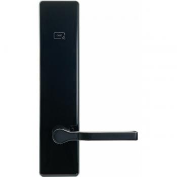 Гостиничный автономный электронный замок. Система: Автономный. Наименование модели: HSU-9959-TH. Размеры (мм): 70 x 300 мм. Вид карт: Mifare Classic в режиме офлайн. Цвет: черный. Материал производства: сплав алюминия + акрил. Наличие механического ключа: Да. Вид механического ключа: на 1 замок / на все замки.. Электропитание: 4 батареи вида AAА. Статический ток: <40 mA. Динамический ток: <150 mA. Дистанция считывания: 0–5 см.. Электромотор: Во врезном механизме. Рабочая влажность: от 15 до 90% RH. Рабочая температура: – 25 – + 65 °С.. Уровень заряда для аварийного сигнала: 4.8 V. Если заряд менее 4.8 V замок можно легко открыть более 100 раз.. Индикаторы: открытия двери, несанкционированных действий, разряда батареи. Светодиоды красного и голубого цвета сообщают статус замка. Память EEPROM: обеспечивает хранение конфигурации на время замены батареек. История: до 1000 записей.. Ручка: со свободным ходом, внешнего типа. Условия монтажа: толщина двери может составлять 30–80 мм (в заказе обязательно указать, если параметры по толщине полотна от 55 мм). Стандартная толщина — 45 мм. Минимум 110 мм должно быть от края двери до декора полотна