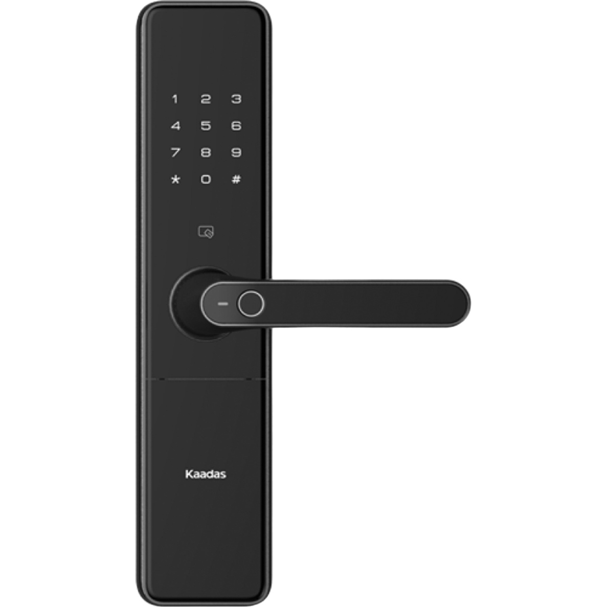 Электронный замок с ручкой врезного типа с полуавтоматичесмкой системой запирания. Оснащен встроенным биометрическим сканером отпечатка пальца, расположенным прямо на ручке. Открывается 10 паролями, запоминает до 100 отпечатков пальцев и 100 RF-карт, есть аварийный механический ключ. Рекомендуемая толщина двери 38-120 мм. Русскоязычный голосовой помошник. Управление через приложение Kaadas. Наличие двойной аутентификации. Встроенный Bluetooth и возможность подключения к умному дому по каналу Z-Wave. Питание от 4х алкалиновых батареек. Габариты замка: 344мм х 169мм х 24мм