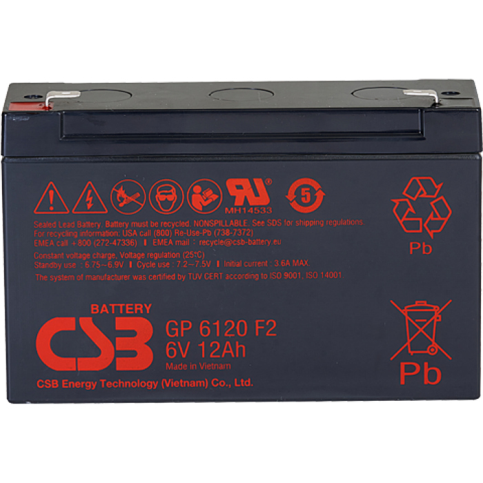 Аккумулятор 6В, 12Ач общего применения со сроком службы 5 лет в буферном режиме или более 260 циклов заряда-разряда в циклическом режиме при 100% разряде. Как и все батареи CSB, она перезаряжаемая, высокоэффективная и не требующая обслуживания. Благодаря специальной формуле производства свинцово-кальциевого сплава и технологиям изготовления - уменьшается процесс газообразования. Номинальное напряжение: 6 В (3 элемента на блок).