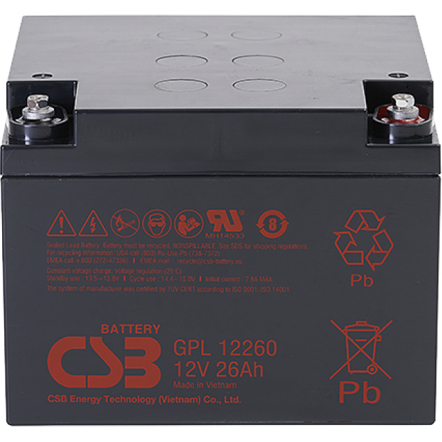 Аккумулятор 12В, 26Ач - батарея общего применения со сроком службы 8 лет (10-12 лет при 20 °С по классификации Eurobat) в буферном режиме или более 260 циклов заряда-разряда в циклическом режиме при 100% разряде. Как и все наши аккумуляторные батареи, она перезаряжаемая, высокоэффективная и не требует обслуживания.