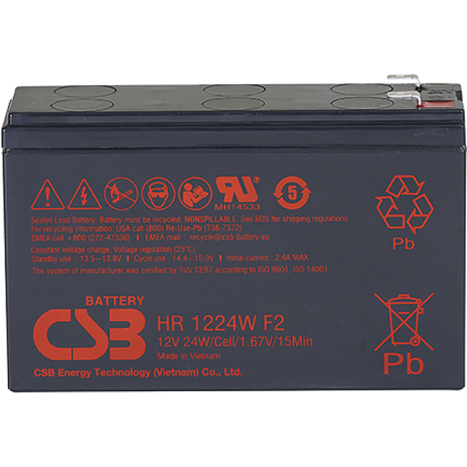 Аккумулятор CSB12В, 24Вт/Эл, с высокой энергоемкостью. Особенная кристаллическая решетка электродов позволила увеличить на 20% отдаваемую мощность по сравнению с батареями других серий. Она разработана для эксплуатации в режиме высоких токов разряда при коротком времени разряда. Срок службы более 5 лет в буферном режиме или более 260 циклов заряда-разряда в циклическом режиме при 100% разряде.