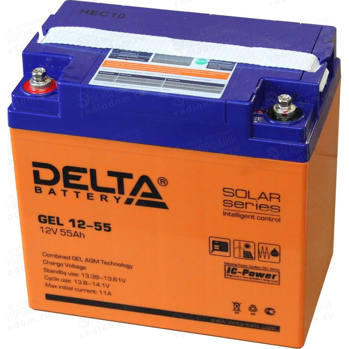 Свинцово-кислотный аккумулятор напряжением 12В и емкостью 55Ач изготовлен по технологии AGM+GEL: combined AGM and GEL technology (частичное сгущение электролита). Устойчив к глубоким разрядам. Дополнительно аккумулятор оснащен LCD дисплеем, отображающем различные статусы работы аккумулятора. Корпус изготовлен из негорючего ABS пластика. Срок службы аккумулятора достигает 10-12 лет. Аккумулятор предназначен для работы в режиме постоянного подзаряда (буферный режим) или в режиме разряд-заряд (циклический режим). Обладает низким внутренним сопротивлением и саморазрядом.