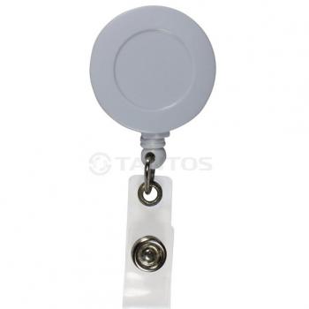 Ретрактор для бейджей и проксимити карт, круглый (d=32 мм), длина нити 65 см, с металлическим зажимом и виниловым ремешком на кнопке для крепления бейджа или карты, цвет- белыйРетрактор предназначен для ношения бейджей и прокисимити карт и представляет собой брелок с вытяжной нитью, работающий по принципу катушки. Встроенный пружинный механизм возвращает нить после использования в исходное положение. На корпусе ретрактора отведено место диаметром 19 мм под наклейку или для печати логотипа.
