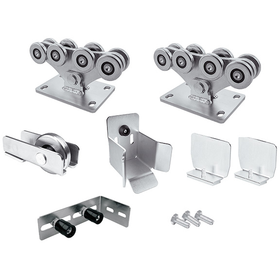 Комплект M-эко для откатных ворот, без направляющего рельса. Состав комплекта: тележка ME с 8 роликами (2 шт), ролик концевой, улавливатель конц. ролика, заглушка для рельса (2 шт), скоба направляющая FRM 2 с 2 роликами, винты М10х25 (15 шт).