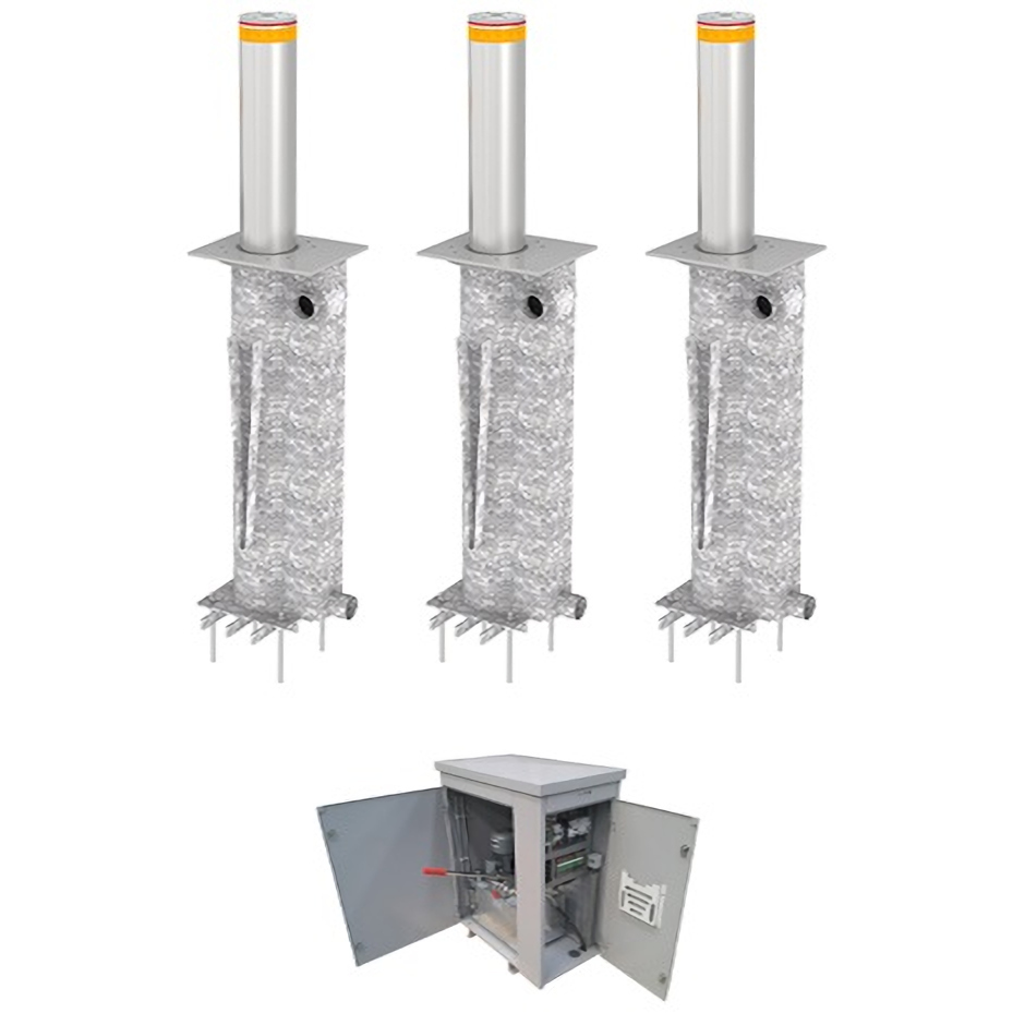 Блокиратор автоматический выдвижной серии TBD Traffic Regulation. В комплекте 3 болларда, шкаф управления с рукавом высокого давления 10 метров, межблочными рукавами 1,2 метра и клапаном аварийного опускания преграды. Столбы оборудованы зуммером, светодиодной индикацией и рубашкой из нержавеющей стали.