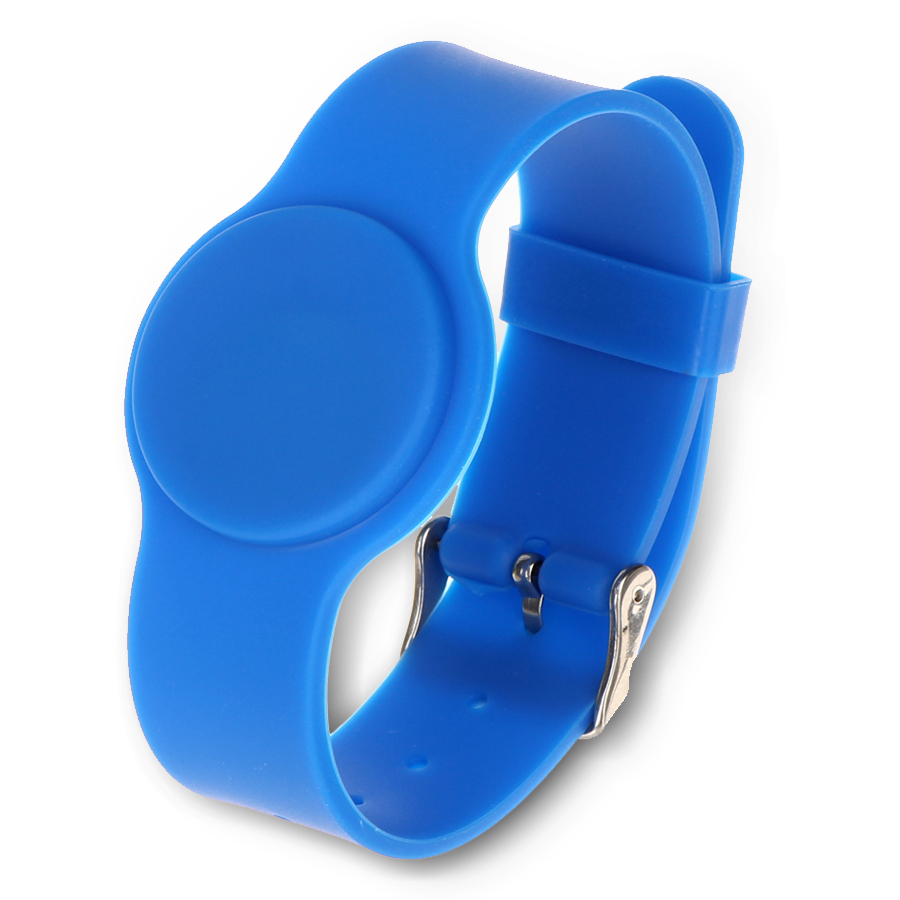 Браслет с рабочей частотой 13,56 МГц водонепроницаемый, с застежкой, материал - силикон, длина (с учётом застежки) - 23,5 см, ширина ремешка - 2 см (3,5 см в самой широкой части), цвета: синий.
