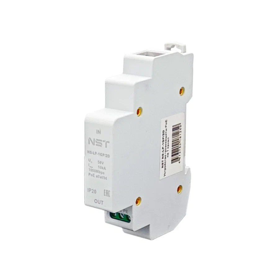 Устройство грозозащиты линий Ethernet + PoE на 1 канал (УЗИП). Класс II. Защищает PoE оборудование, подключенное к линиям Ethernet от наведенного напряжения высоких энергий. Скорость передачи данных: 10/100/1000 Мбит/c. Стандарты PoE: IEEE802.3 af/at/bt до 90W. Защищаемые контакты: 1-8. Номинальное рабочее напряжение Un - 48V DC. Максимльное рабочее напряжение Um - 60V DC. Номинальный ток разряда In - до 5kA. Максимльный ток разряда Imax - до 10kA. Время отклика - до 1нс. Вход - Розетка RJ45, Выход - Розетка RJ45. Заземление - клеммная колодка.