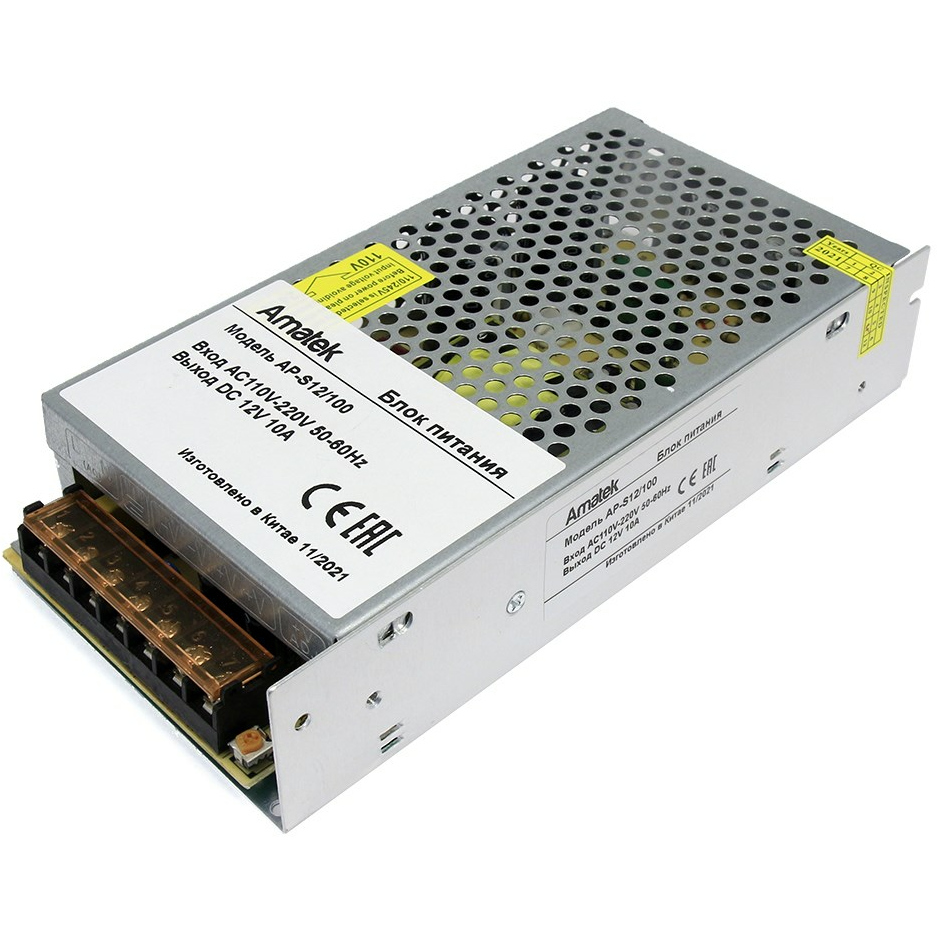 Блок питания =12В/10А, стабилизированный. Выход: 12В±5%, 10А, 120Вт; вход ~110-220В, 50-60Гц. Защита от перегрузки и короткого замыкания с автоматическим восстановлением. Металлический корпус.