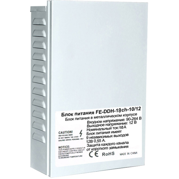 Блок питания в металлическом корпусе . Входное напряжение 90-264V, Выходное 12V, Номинальный ток 10A. Блок питания имеет 18 независимых выходов 12V 0,55A, защита каждого канала от короткого замыкания.