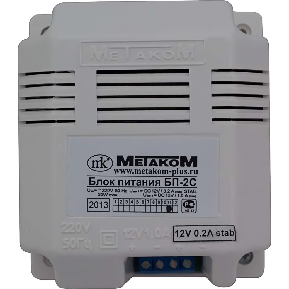 Блок питания предназначен для питания постоянным током домофонных систем Метаком. Питание блока осуществляется от сети переменного тока напряжением 220В частотой 50Гц. Блок может эксплуатироваться в интервале температур от -10 до +40С при относительной влажности воздуха не более 95%. Блок питания имеет защиту от перегрузки как по входу, так и по каждому из выходов. Первый канал (стабилизированное напряжение): 12±0,5В, 0,3А. Второй канал (нестабилизированное напряжение): 13±1,5В, 0,8А
