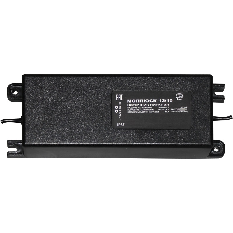 Малогабаритный блок питания 12В, 10А, габариты 205х70х40 мм, защита выхода от КЗ и перегрузки, прочность изоляции 3 кВ, проушины для крепления, корпус IP67.