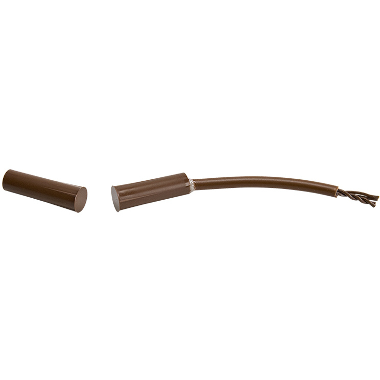 Магнитоконтактный извещатель врезной, пластмассовый корпус (коричневый), тамперный шлейф, монтаж вдавливанием - без употребления клея или шурупов, кабель 110 см., подключение проводов непосредственно внутри корпуса. Тип извещателей NC, максимальное переключаемое напряжение геркона 20 В, максимальный ток 20 mA, размеры (мм):Ø 7,2, длина 32,6. Диапазон рабочих температур - 30°C...+ 65°C.