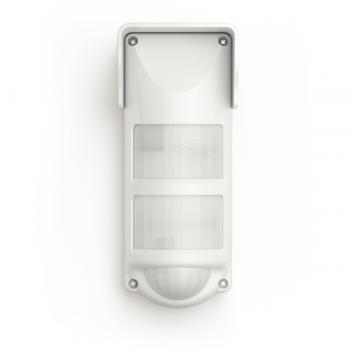 Инфракрасный объемный датчик для открытых площадок. Передает сообщения по двунаправленному каналу связи в диапазоне частот 433,05—434,79 МГц. Имеет резервный источник питания. Устойчив к перемещению в пределах зоны обнаружения животных весом до 20 кг, воздействию перепадов фоновой освещенности до 20 000 лк, изменению температуры фона со скоростью до 5° С/мин. Для защиты датчика от осадков предусмотрен козырек.