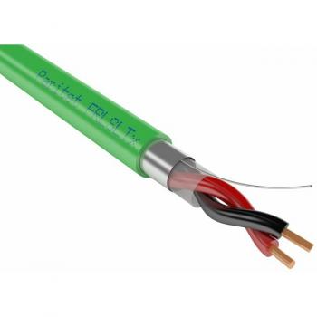 Кабель парной скрутки с медными однопроволочными жилами, с изоляцией пониженной пожарной опасности с низким дымо- и газовыделением и низкой токсичностью продуктов горения, 1х2х1,38 мм, внешний диаметр 6.2 мм, диапазон рабочих температур -40...+70°С, цвет оболочки зеленый