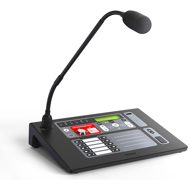 Пульт микрофонный: 10 зон, подключение к моноблокам SPM-B, SPM-С по интерфейсу DAP, доп. вход питания 24 В, прием сигнала АВАРИЯ (сухой контакт) от ИВЭПР