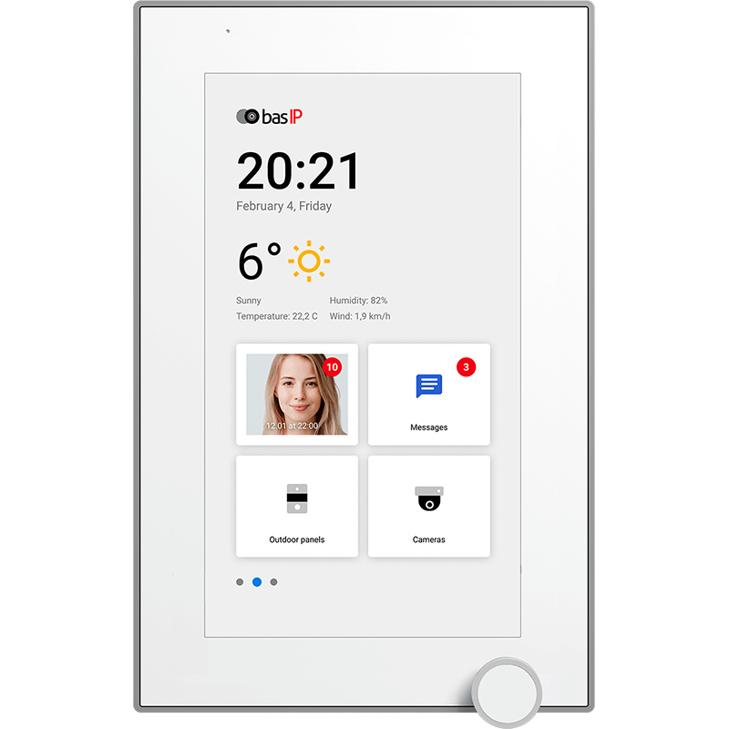 7-дюймовый IP-видеомонитор для помещений с возможностью горизонтального и вертикального монтажа, возможностью управления лифтом, отображением сообщений от управляющей компании, PoE, подключением 32 камер, памятью для фотографий/видео и голосовой почтой. ОПЕРАЦИОННАЯ система – Android. Размеры: 195 x 127 x 27 мм. Корпус: пластик, стекло.