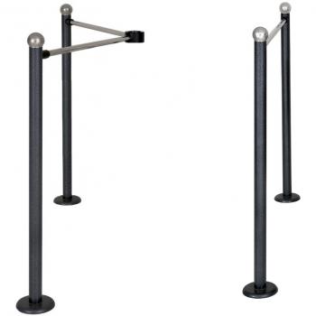 Ограждение прямое. Комплект состоит из трех горизонтальных перемычек, четырех стационарных крашеных стоек, две из которых соединены через разрезное кольцо с турникетом. Исполнение крашенное.