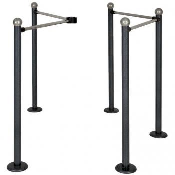 Ограждение угловое. Комплект состоит из четырех горизонтальных перемычек, пяти стационарных крашеных стоек, две из которых соединены через разрезное кольцо с турникетом.