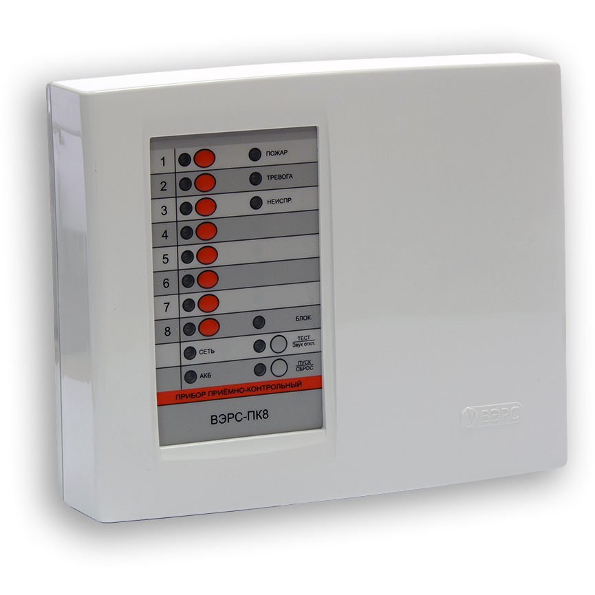 Прибор приемно-контрольный охранно-пожарный 8 ШС (охранные, пожарные, технологические), 3 реле ПЦН, выходы ОК с током нагрузки до 1А с контролем линий оповещения, вход ТМ, RS-485, встроенный регистратор событий, конфигурирование с помощью ВЭРС-ПК Prog, напряжение питания 220 В, вход внешнего РИП, под АКБ 12 В /4,5 Ач, пластиковый корпус, считыватель ТМ в комплекте.