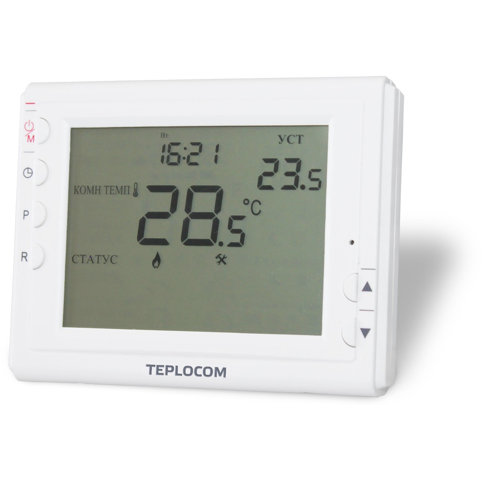 Проводной программируемый комнатный термостат. Питание от двух батарей типа АА, 2 шт. Контакты реле до 250В, 8А. Температура регулировки от 5°С до 35°С. Гистерезис ±0,5°С. Большой LCD дисплей. Индикация температуры в помещении. Индикация состояния котла. Индикация разряда батарей. Индикация неисправности системы. Часы реального времени. Калибровка температуры. Установка индивидуальной программы для каждого из 7 дней недели. Установка ограничения максимальной и минимальной температуры. Установка значения гистерезиса. Функция защиты насоса. Функция защиты системы от замерзания. Функция отпуск. Функция фиксации температуры. Работа с нормально открытой или нормально закрытой логикой