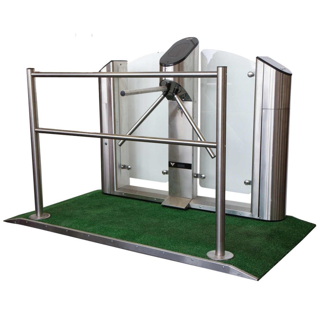 Корпус из шлифованной нерж. стали; планки из шлифованной нерж.стали; светодиодный дисплей с крышкой из полированного искусственного камня; пульт д/у (металлический корпус) с кабелем; электродвигатель сервопривода планок; автоматич. функция «Антипаника»; дверца стойки с замком для быстрого доступа; ключи от замка дверцы стойки - 2 шт; крышка основания скрывающая крепление турникета к полу; картоприемник; 2 стекла-стенки. Габаритные размеры (ШхВхГ), мм: в рабочем состоянии - 985х1090х840; со сложенными планками - 985х1090х340.