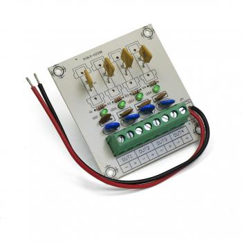 Плата распределения питания 12В на 4 выхода по 1А. Защитно-коммутационное устройство на 4 канала (1А каждый). Плата для цепей питания постоянного напряжением 12В / 4А (4канала по 1А) с защитой от кратковременного перенапряжения и короткого замыкания. Автовосстановление питания после устранения неисправности. 4 выхода (клеммы) 12В до 1А каждый. Самовосстанавливаемый предохранитель и индикация по каждому каналу. Вход – проводное подключение 12В до 4А. Размеры 65х60х20мм.