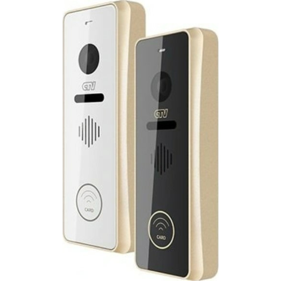 Вызывная панель для видеодомофона, корпус из алюминиевого сплава, передняя панель из стекла, сенсорное управление, две передних декоративных накладки в комплекте, встроенный считыватель Em-Marine, контроллер вых интерфейс Wiegand 26, подсветка кнопки вызова, 3 брелока, монт. уголок в комплекте, цв корп. шампань