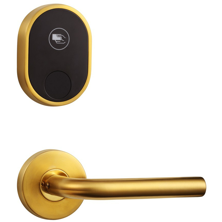 Замок гостиничный беспроводной. Дизайн "Матовое золото", материал: нержавеющая сталь. Раздельные ручки и считыватель Врезной механизм ANSI, ригель - сталь.