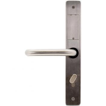 Замок гостиничный беспроводной. Дизайн "Матовое серебро", материал: нержавеющая сталь. Вся электроника и приводы в накладке. Допускается установка на существующий врезной механизм, DIN цилиндр. Функции быстрой смены направления ручек и защелки. Онлайн, BLE