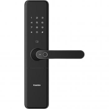 Электронный замок с ручкой врезного типа с полуавтоматичесмкой системой запирания. Оснащен встроенным биометрическим сканером отпечатка пальца, расположенным прямо на ручке. Открывается 10 паролями, запоминает до 100 отпечатков пальцев и 100 RF-карт, есть аварийный механический ключ. Рекомендуемая толщина двери 38-120 мм. Русскоязычный голосовой помошник. Управление через приложение Kaadas. Наличие двойной аутентификации. Встроенный Bluetooth и возможность подключения к умному дому по каналу Z-Wave. Питание от 4х алкалиновых батареек. Габариты замка: 344мм х 169мм х 24мм